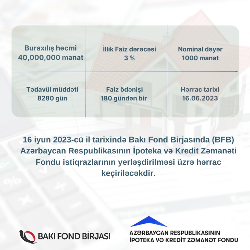 16 iyun 2023-cü il tarixində Bakı Fond Birjasında (BFB) Azərbaycan Respublikasının İpoteka və Kredit Zəmanəti Fondu istiqrazlarının yerləşdirilməsi üzrə hərrac keçiriləcəkdir.