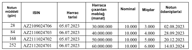 5 iyul və 6 iyul 2023-cü il tarixlərində Bakı Fond Birjasında Azərbaycan Respublikasının Mərkəzi Bankının notlarının yerləşdirilməsi üzrə hərrac keçiriləcəkdir.