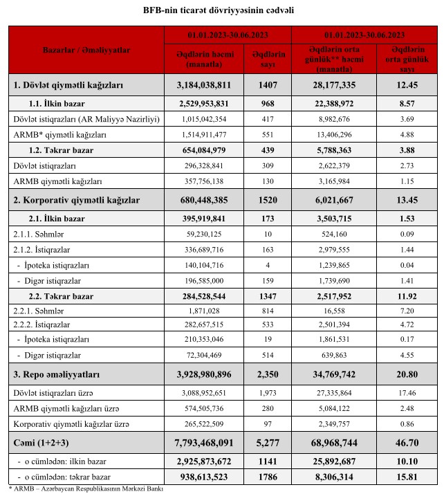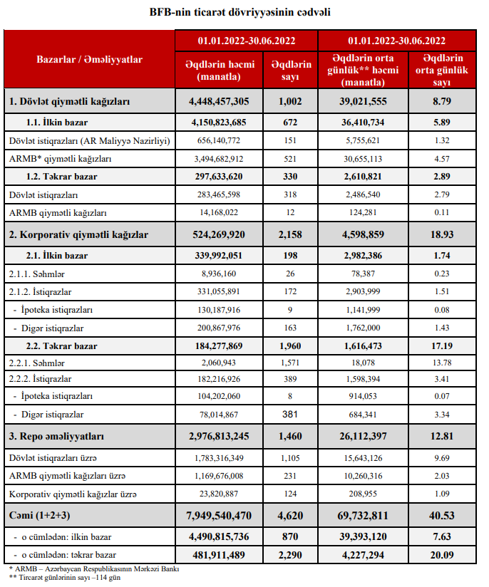 Xatırladaq ki, Bakı Fond Birjasında 01.01.2022-30.06.2022 tarixləri ərzində qiymətli kağızlar üzrə keçirilən əməliyyatların ümumi həcmi 7 milyard 949 milyon 540 min 470 manat təşkil etmişdi.