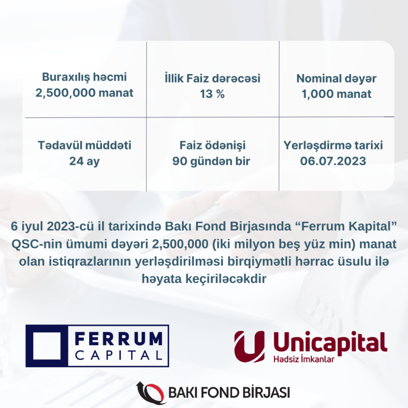 4 iyul 2023-cü il tarixində Bakı Fond Birjasının (BFB) Listinq Komitəsinin qərarı “Ferrum Kapital” QSC-nin ümumi dəyəri 2 milyon 500 min manat olan istiqrazları standart bazar seqmentində listinqə daxil edilib.