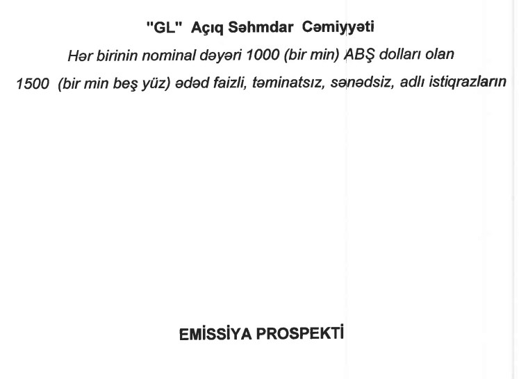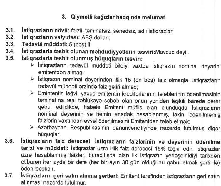 Marja.az xəbər verir ki, şirkət hər birinin nominal dəyəri 1 000 ABŞ dolları olan 1 500 ədəd faizli, təminatsız, sənədsiz, adlı istiqrazlar təklif edəcək.