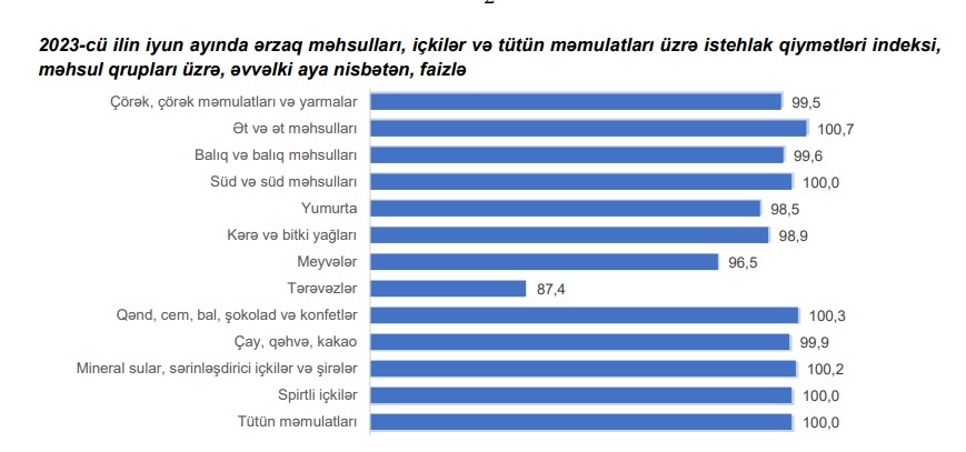 Cari ilin iyun ayında əvvəlki aya nisbətən ayrı-ayrı ərzaq məhsullarından daha çox ucuzlaşma qarabaşaq yarmasının, çörəyin, unun, təzə balığın, sterilizə olunmuş üzlü südün, yumurtanın, süfrə marqarininin, kərə, günəbaxan və qarğıdalı yağlarının, əriyin, gilasın, çiyələyin, bananın, xiyarın, pomidorun, bibərin, badımсanın, göy lobyanın, sarımsağın, soğanın, kartofun, yerkökünün, mərcinin, bahalaşma isə əsasən yumru düyünün, mal və qoyun ətinin, xamanın, zeytun yağının, limonun, kələmin, çuğundurun, şəkər və şəkər tozunun, kola içkisinin, limonadın qiymətlərində müşahidə olunmuşdur. Digər ərzaq məhsullarının qiymətlərində ciddi dəyişikliklər baş verməmişdir.
