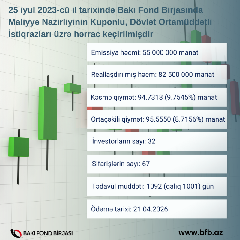 25 iyul 2023-cü il tarixində Bakı Fond Birjasında Azərbaycan Respublikası Maliyyə Nazirliyinin AZ0201040109 ISIN-li, 55 milyon manat həcmində, 1092 (qalıq 1001) gün olan tədavül müddətli Kuponlu, Dövlət Ortamüddətli İstiqrazlarının (DOİ) yerləşdirilməsi üzrə hərrac keçirilib.