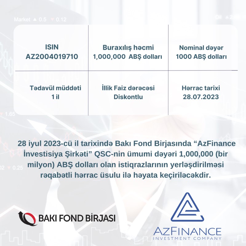 6 iyul 2023-cü il tarixində Bakı Fond Birjasının (BFB) Listinq Komitəsinin qərarı “AzFinance İnvestisiya Şirkəti” QSC-nin ümumi dəyəri 1 milyon ABŞ dolları olan istiqrazları standart bazar seqmentində listinqə daxil edilib. Diskontlu təmin edilməmiş, sənədsiz, adlı istiqrazların hər birinin nominaı dəyəri 1000 ABŞ dolları, sayı 1000 ədəd, tədavül müddəti 1 ildir.
