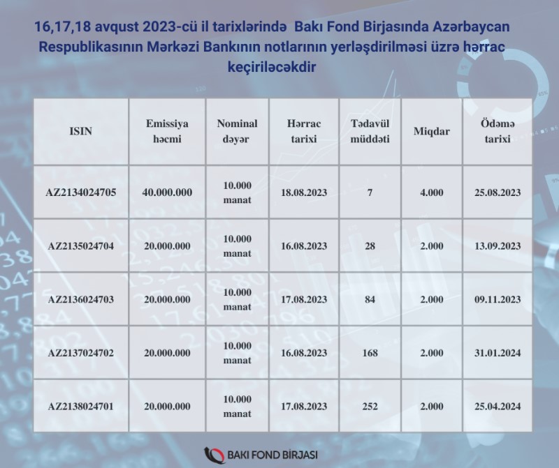 16,17,18 avqust 2023-cü il tarixlərində Bakı Fond Birjasında Azərbaycan Respublikasının Mərkəzi Bankının notlarının yerləşdirilməsi üzrə hərrac keçiriləcəkdir. Hərraca çıxarılan ümumi məbləğ 120 milyon manatdır.