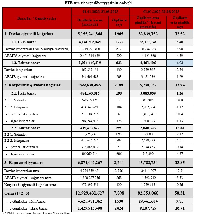 2023-cü ilin yanvar-avqust ayları ərzində (8 ayda) Bakı Fond Birkasının ilkin bazarında Maliyyə Nazirliyinin 1 milyard 719 milyon 791 min manatlıq qiymətli kağızları (dövlət istiqrazları) yerləşdirilib.