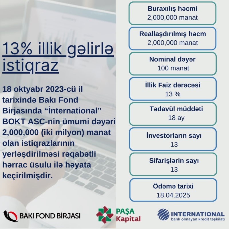 18 oktyabr, 2023-cü il tarixində Bakı Fond Birjasında “İnternational” BOKT ASC-nin tədavül müddəti 18 ay, nominal dəyəri 100 manat olan AZ2007021028 dövlət qeydiyyat nömrəli, ümumi dəyəri 2 milyon manat olan, faizli, təmin edilməmiş sənədsiz, adlı istiqrazlarının yerləşdirilməsi üzrə hərrac yekunlaşıb.