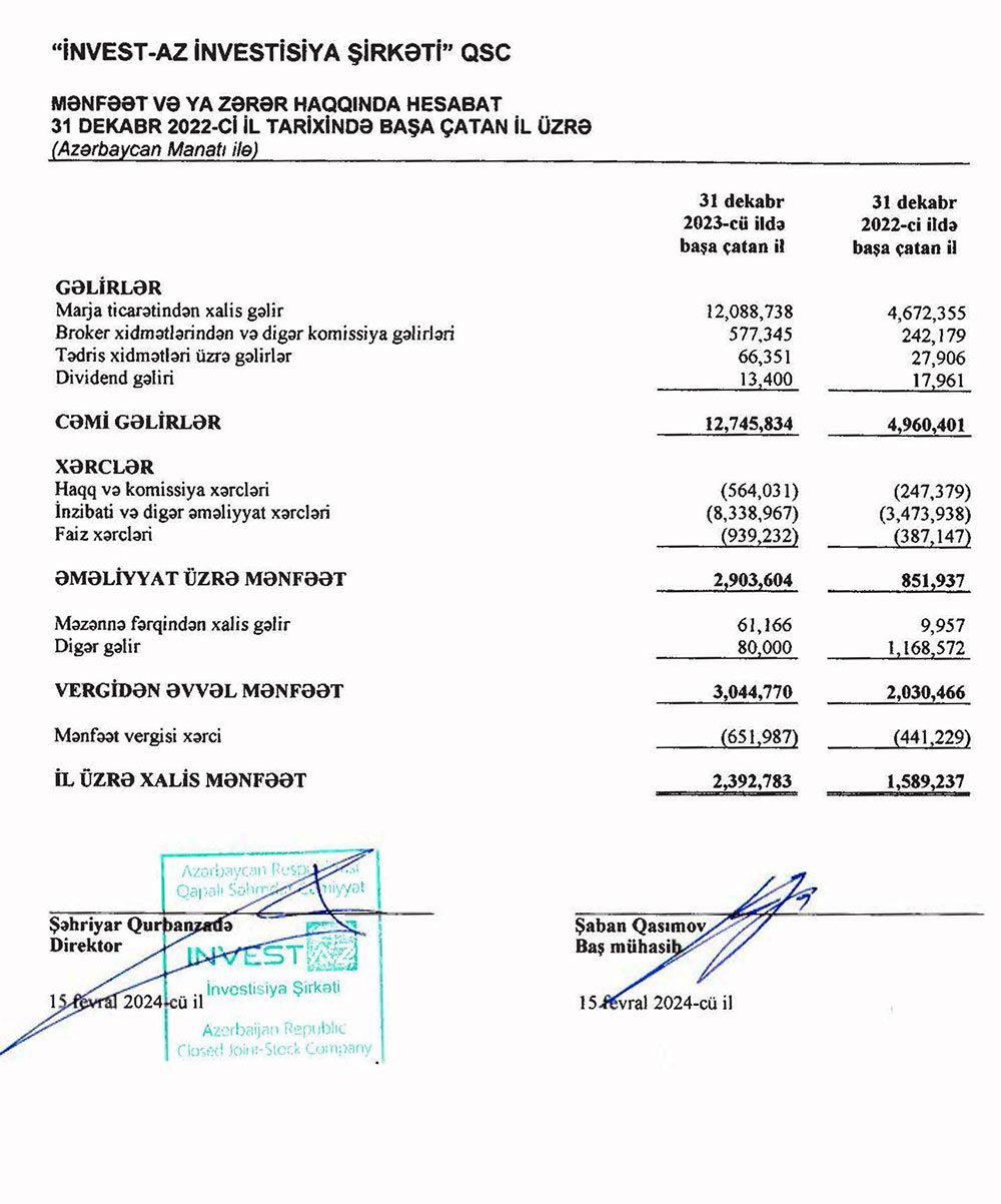 Marja.az Şirkətin maliyyə hesabatlarına istinadən xəbər verir ki, "İnvest-AZ İnvestisiya Şirkəti"nin cəmi gəlirləri 2022-ci ildə 4 milyon 960 min manat ikən, 2023-cü ildə 12 milyon 746 min manata yüksəlib (7 milyon 785 min manat və ya 2,6 dəfə artıb).