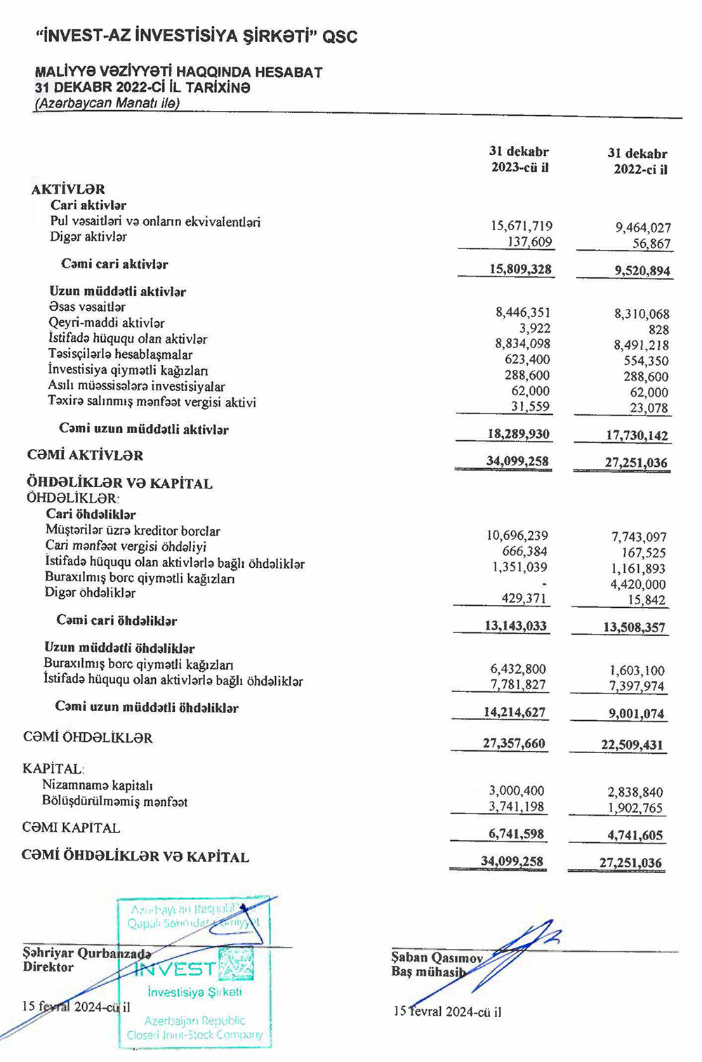 Ötən il cəmi “İnvest-AZ İnvestisiya Şirkəti”nin cəmi aktivləri 6 milyon 848 min manat və ya 25,1% artaraq 34 milyon 99 min manata çatıb.
