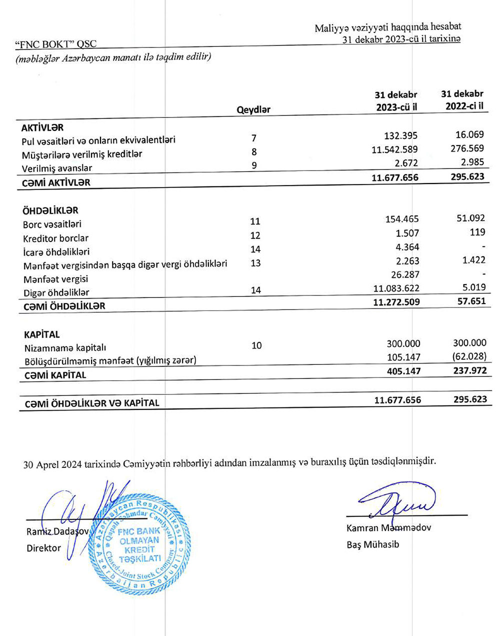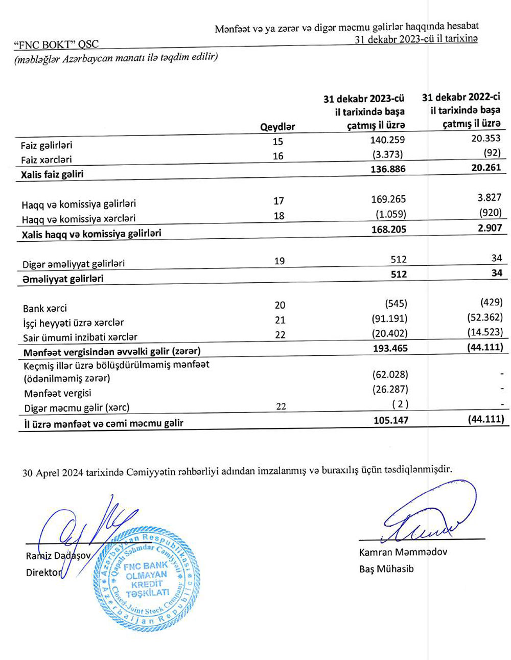 "FNC BOKT" QSC 2023-cü ili 105 min manat xalis mənfəət ilə başa vurub. Kredit şirkəti 2022-ci ili 44 min manat xalis zərər ilə bağlamışdı.