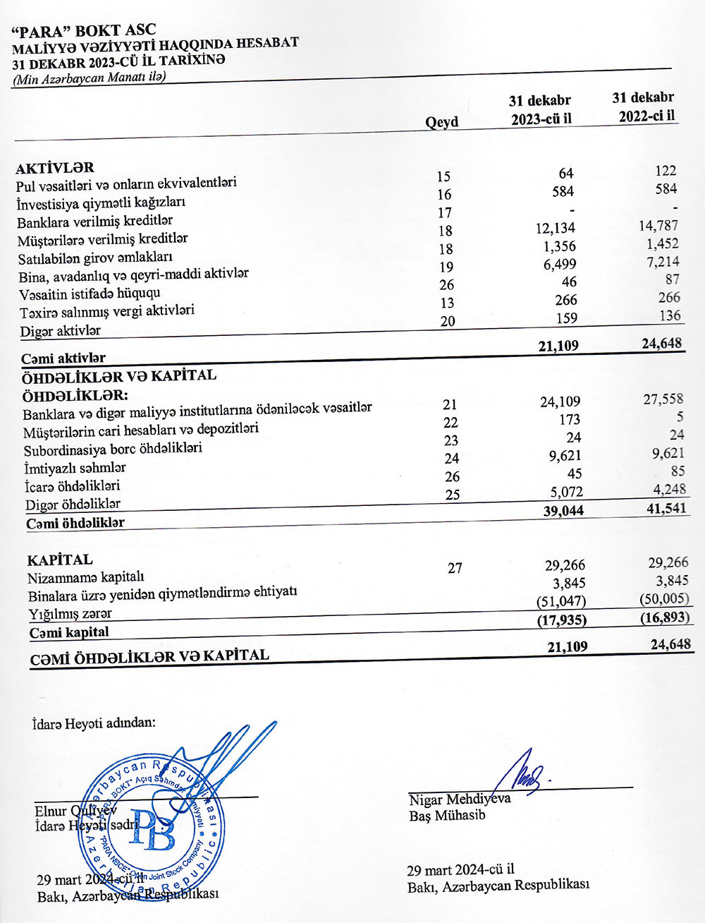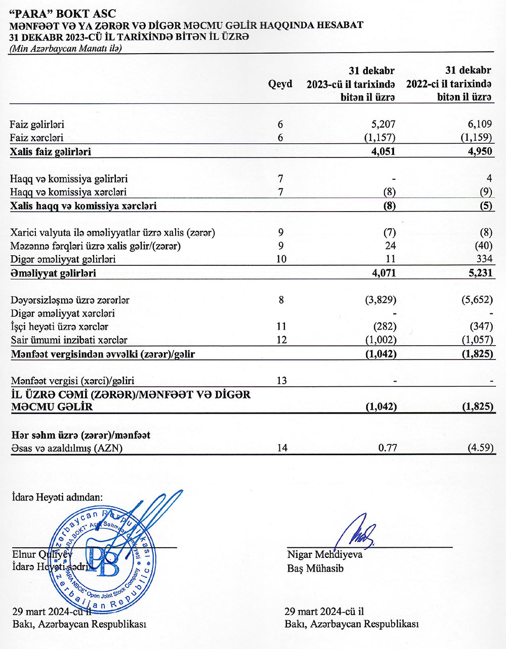 "PARA BOKT" ASC 31 dekabr 2023-cü il tarixində bitən il üzrə maliyyə hesabatlarını açıqlayıb.