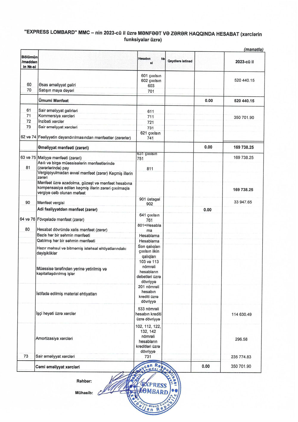Lombard fəaliyyətilə məşğul olan "Express Lombard" MMC 2023-cü ili 135 min 791 manat xalis mənfəət ilə başa vurub.