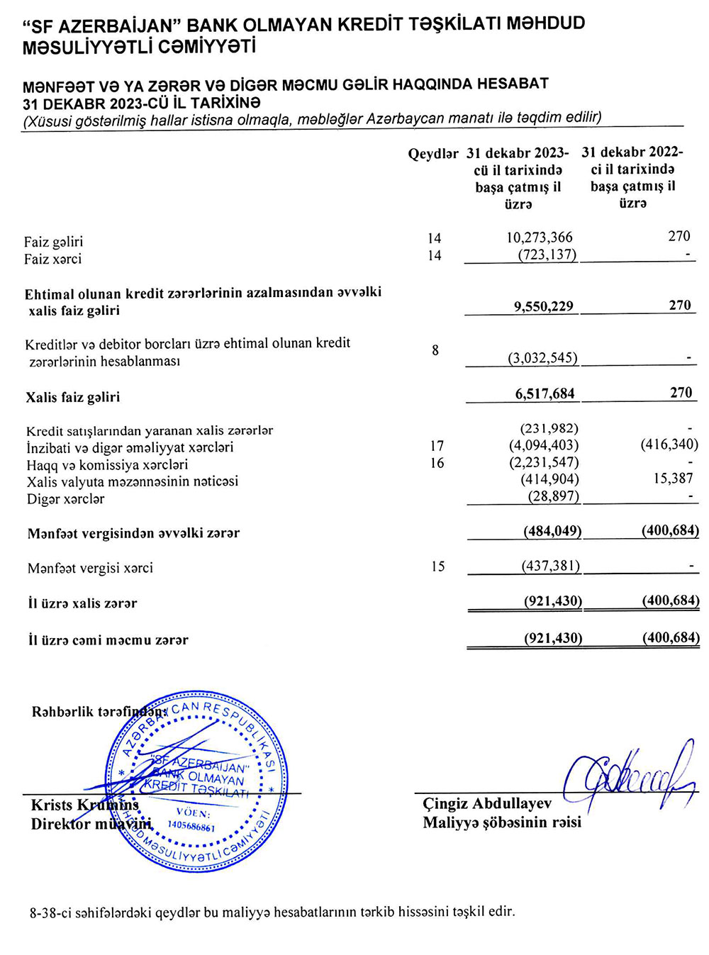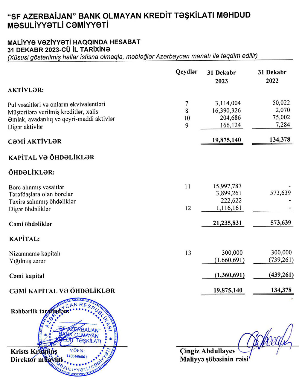 Ötən il "SF Azerbaijan" BOKT-ın cəmi kredit portfeli (müştərilərə verilmiş kreditlər) 7918 dəfə artaraq 31 dekabr 2023-cü il tarixində 16 milyon 390 min manata çatıb. Təşkilat 2022-ci ilin sonunda 2 min 70 manat cəmi kredit portfelinə malik idi.