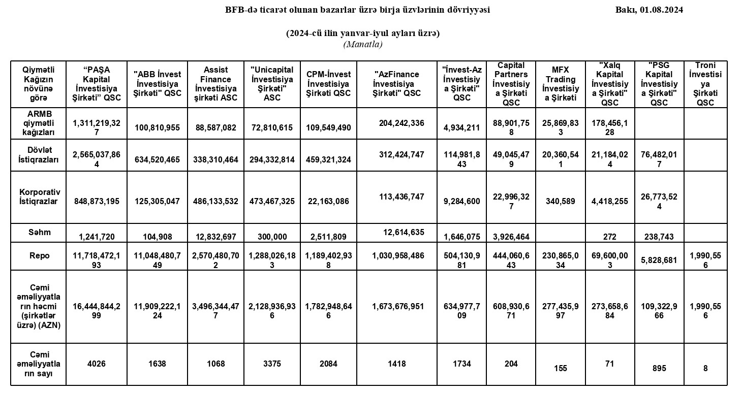 Marja.az Birjaya istinadən xəbər verir ki, 16 milyard 444 milyon 844 min 299 manat əməliyyat həcmi ilə “PAŞA Kapital İnvestisiya Şirkəti” QSC 1-ci, 11 milyard 909 milyon 222 min 124 manat əməliyyat həcmi ilə "ABB İnvest İnvestisiya Şirkəti" QSC 2-ci, 3 milyard 496 milyon 344 min 477 manat əməliyyat həcmi ilə "Assist Finance İnvestisiya Şirkəti" ASC 3-cü, 2 milyard 128 milyon 937 min manat əməliyyat həcmi ilə "Unicapital İnvestisiya Şirkəti" 4-cü, 1 milyard 782 milyon 949 min manat əməliyyat həcmi ilə "CPM-İnvest İnvestisiya Şirkəti "QSC 5-ci, 1 milyard 673 milyon 676 min manat əməliyyat həcmi ilə "AzFinance İnvestisiya Şirkəti" QSC 6-cı 504 milyon 130 min 981 manat əməliyyat həcmi ilə "İnvest-Az İnvestisiya Şirkəti" QSC 7-ci olub.