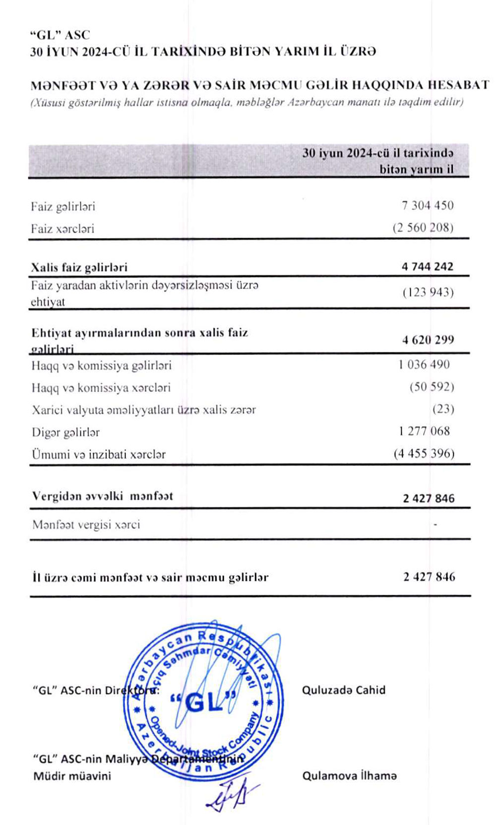 Qeyd edək ki, "GL" ASC 2023-cü ili 2 milyon 8756 min manat xalis mənfəət ilə bağlamışdır.