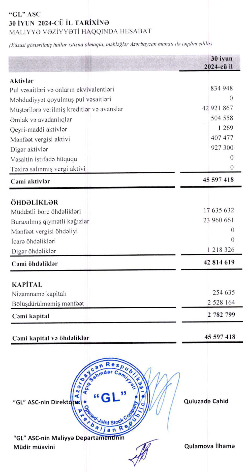"GL" ASC kredit portfeli (müştərilərə verilmiş kreditlər) 30 İyun 2024-cü il tarixində 42 milyon 922 min manata çatıb. 30 İyun 2023-cü il tarixində "GL" ASC-nin kredit portfeli 35 milyon 710 min manat təşkil etmişdi. Beləliklə, müqayisə olunan dövrdə təşkilatın kredit portfeli 7 milyon 212 min manat və ya 20,2% artıb. Qeyd edək ki, "GL" ASC-nin kredit portfeli 2023-cü ilin sonunda 39 milyon 524 min manata çatmışdı.