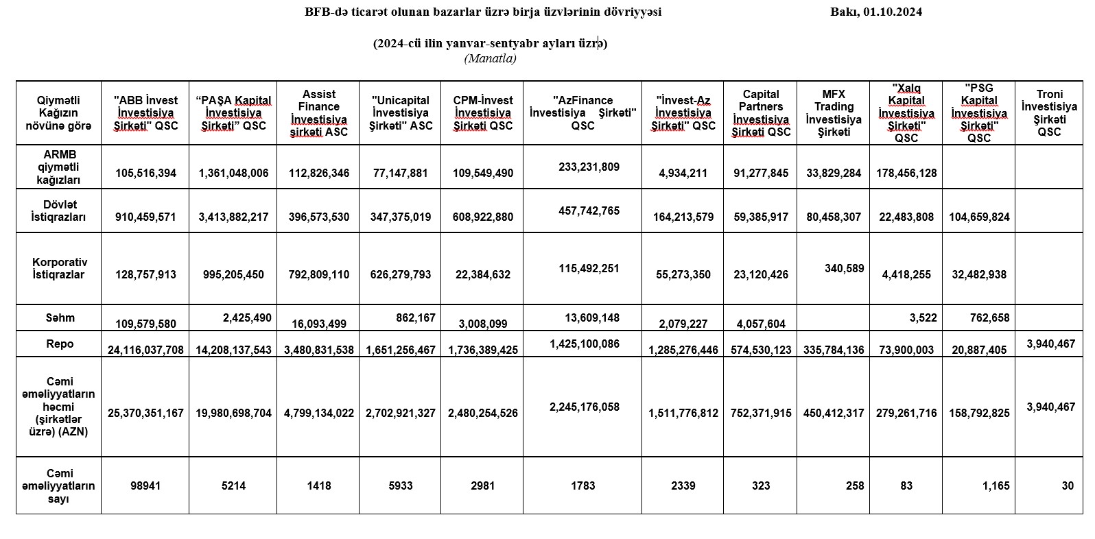 Marja.az Birjaya istinadən xəbər verir ki, 2024-cü ilin yanvar-sentyabr ayları ərzində "ABB İnvest İnvestisiya Şirkəti" QSC 25 milyard 370 milyon 351 min manatlıq dövriyyə ilə 1-ci, “PAŞA Kapital İnvestisiya Şirkəti” QSC 19 milyard 980 milyon 699 min manatlıq dövriyyə ilə 2-ci və "Assist Finance İnvestisiya Şrkəti" ASC 3 milyard 480 milyon 832 min 8 manatlıq dövriyyə ilə 3-cü yeri tutub.