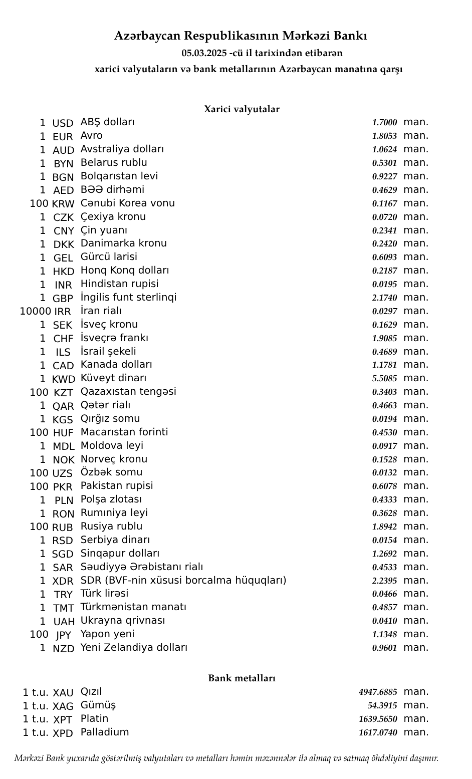 Rəsmi məzənnələr açıqlandı