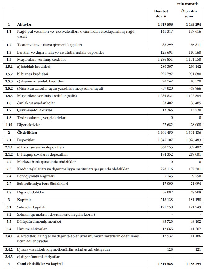 Bankın ümumi kredit portfeli 1 milyard 296,9 milyon manat təşkil edib. Bu göstərici ilin əvvəlinə nisbətən 145,3 milyon manat və ya 12,6% artıb.