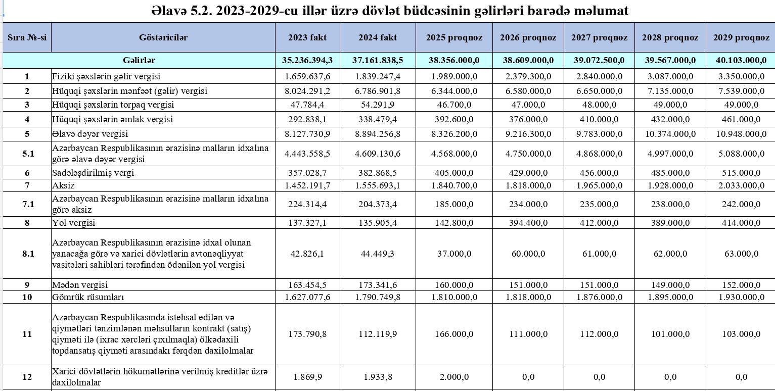 Marja.az rəsmi proqnozlara istinadən xəbər verir ki, 2023-cü ildə 35 milyard 236 milyon manat olan ümumi gəlirlər 2029-cu ilə qədər 40 milyard 103 milyon manata çatacaq — bu, təxminən 4 milyard 867 milyon manatlıq artım və təxminən 13.8% artım deməkdir.