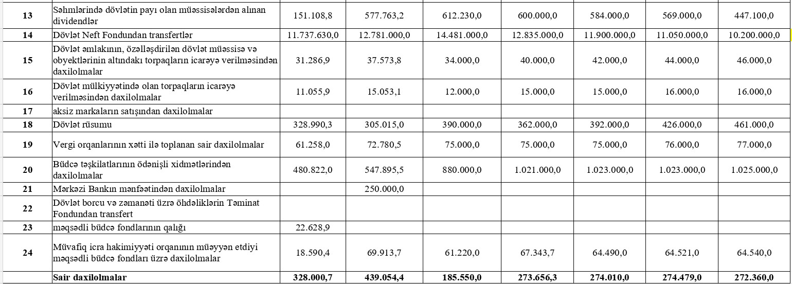 Qeyri-vergi gəlirləri 2023-cü ildə 14 milyard 974 milyon manat olub və 2025-ci ildə 18 milyard 709 milyon manat səviyyəsində pik həddə çatır. Lakin 2025–2029 dövründə ardıcıl azalma proqnozlaşdırılır — 2029-cu ildə qeyri-vergi gəlirləri 14 milyard 642 milyon manata geriləyəcək.