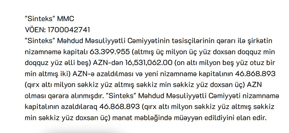 Marja.az Dövlət Vergi Xidmətinə istinadən xəbər verir ki, "Sinteks" Məhdud Məsuliyyətli Cəmiyyətinin təsisçilərinin qərarı ilə şirkətin nizamnəmə kapitalı 63 milyon 399 min 955 manatdan 16 milyon 531 min 62 manat azaldılması və yeni nizamnamə kapitalının 46 milyon 868 min 893 manat olması qərara alınıb.