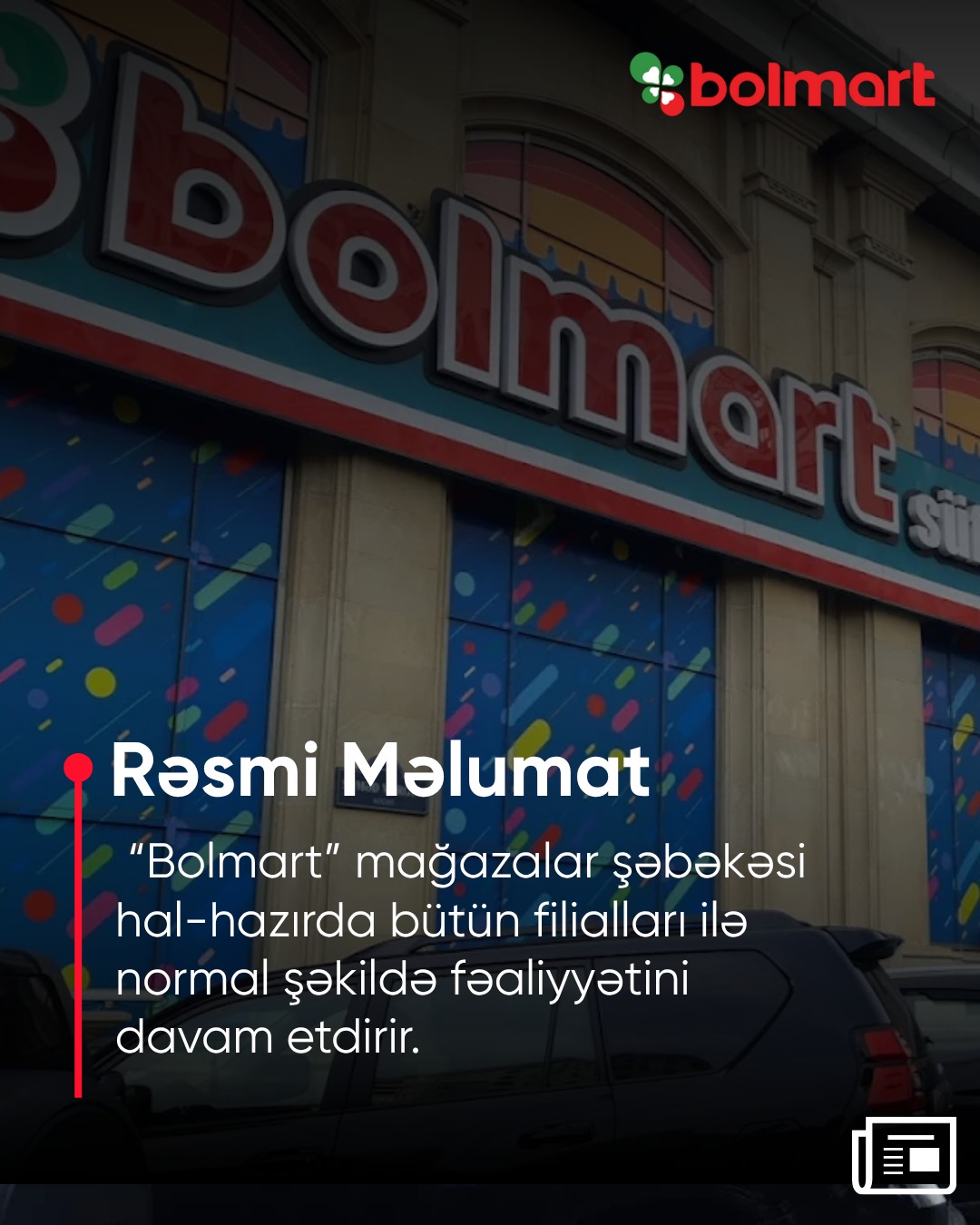"Son günlər “Bolmart” mağazalar şəbəkəsi ilə bağlı sosial mediada və bəzi xəbər platformalarında yayılan məlumatlarla əlaqədar olaraq bildiririk ki, “Bolmart” mağazalar şəbəkəsi hal-hazırda bütün filialları ilə normal şəkildə fəaliyyətini davam etdirir.
