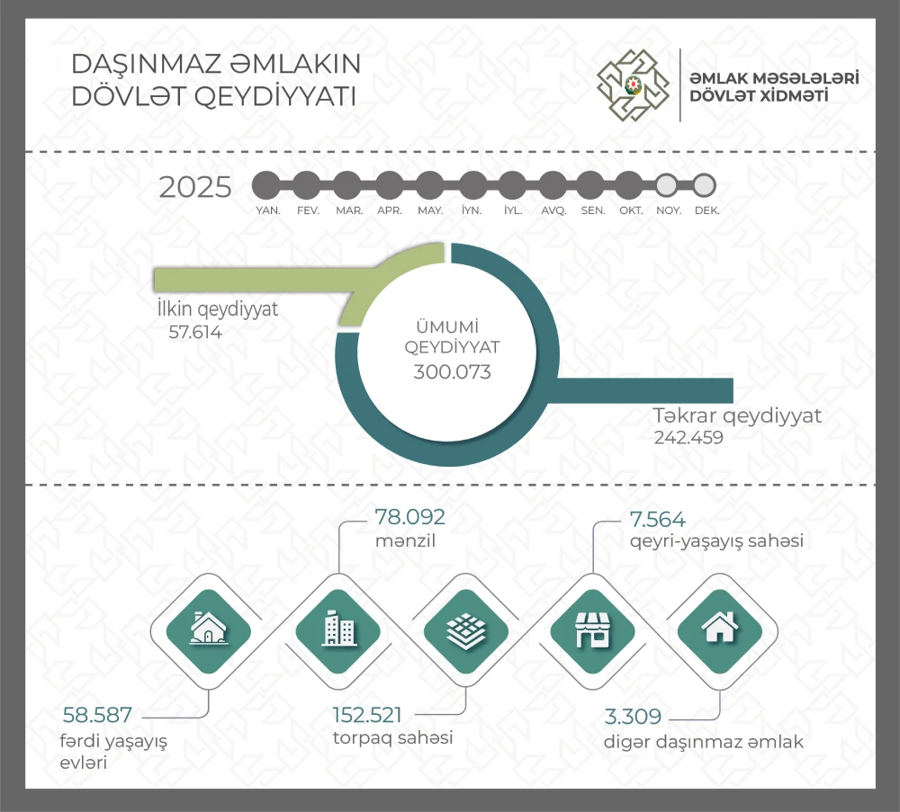 2025-ci ilin yanvar-oktyabr ayları ərzində fərdi yaşayış və bağ evi üzərində – 58.587, mənzil – 78.092, torpaq sahəsi – 152.521, qeyri-yaşayış binası – 2.592, qeyri-yaşayış sahəsi – 7.564, əmlak kompleksi – 616, çoxmərtəbəli yaşayış binası – 98 və çoxillik əkmələr üzərində – 3 mülkiyyət hüququnun dövlət qeydiyyatı aparılıb. Bu dövrdə qeydiyyata alınan mülkiyyət hüquqlarının 84.431-i Bakı şəhərinin, qalan hissəsi isə bölgələrin payına düşür.