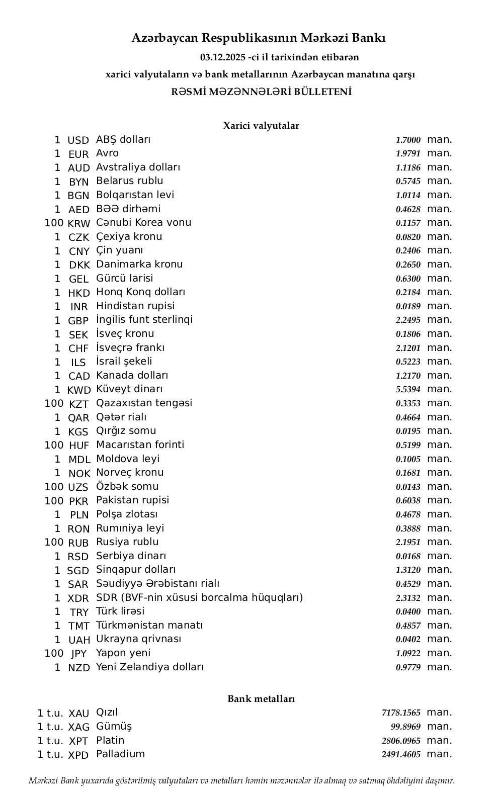 Rəsmi məzənnələr açıqlandı