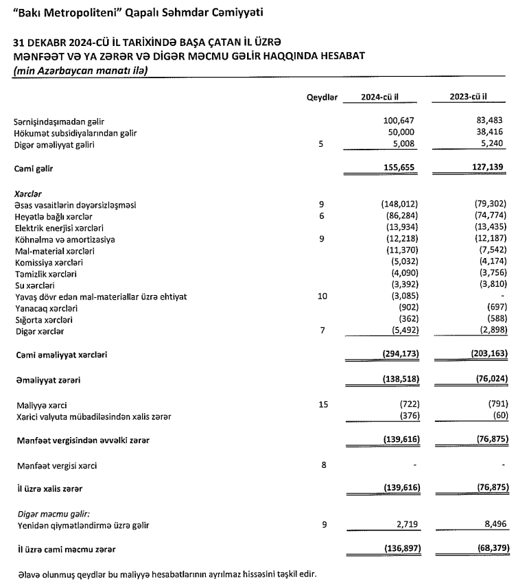 Bakı Metropoliteni: Zərərlər aşağı sərnişindaşıma tarifləri səbəbindən yaranır."Bakı Metropoliteni" Qapalı Səhmdar Cəmiyyəti 2024-cü ili 139 milyon 616 min manat xalis zərər ilə başa vurub. QSC 2023-cü ili 76 milyon 875 min manat xalis zərər ilə bağlamışdı. Beləliklə, "Bakı Metropoliteni"nin xalis zərəri 2024-cü ildə 2023-cü illə müqayisədə 62 milyon 741 min manat və ya 81,6% artıb.