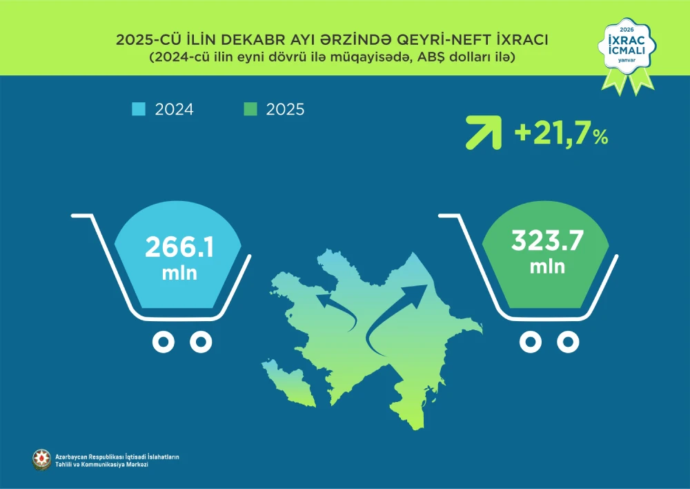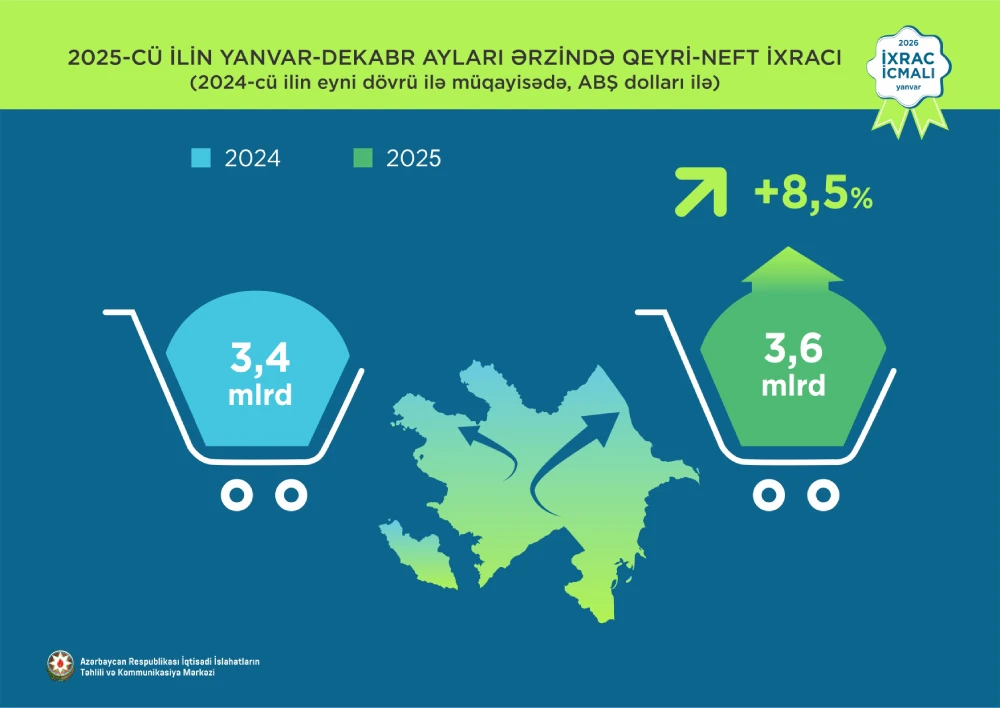 Marja xəbər verir ki, İcmala əsasən, 2025-ci ilin yanvar-dekabr aylarında  Azərbaycanın qeyri-neft sektoru üzrə ixracı 2024-cü ilin müvafiq dövrü ilə müqayisədə 8,5% artaraq 3,6 milyard ABŞ dolları təşkil edib. 2025-ci ilin yanvar-dekabr aylarında yeyinti məhsulları üzrə ixrac 18,4% artaraq 1,2 milyard ABŞ dollarına bərabər olub.