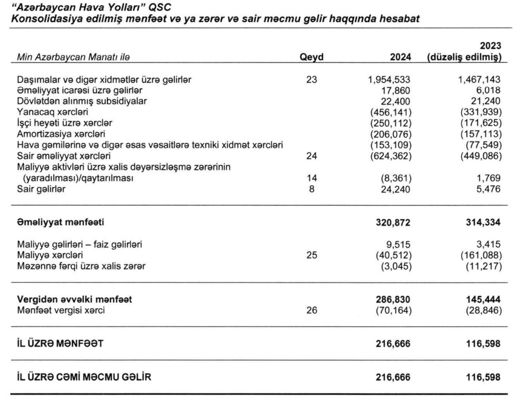 Uçuş coğrafiyasının genişləndirilməsi və görülən digər işlər "Azərbaycan Hava Yolları" QSC-nin (AZAL) maliyyə göstəricilərinə müsbət göstərib. AZAL 2024-cü ili 216 milyon 666 min manat xalis mənfəət ilə başa vurub. Halbuki, Şirkət 2023-cü ili 116 milyon 598 min manat xalis mənfəət ilə bağlamışdı. Beləliklə, AZAL-ın xalis mənfəəti 2024-cü ildə 2023-cü illə müqayisədə 100 milyon 68 min manat və ya 85,8% artıb. Əməliyyat icarəsi üzrə gəlirlərin, sair gəlirlərin, maliyyə gəlirlərinin (faiz gəlirlərinin) artması və maliyyə xərclərinin kəskin azalması hesabına dövlət şirkətinin xalis mənfəətində artım baş verib.