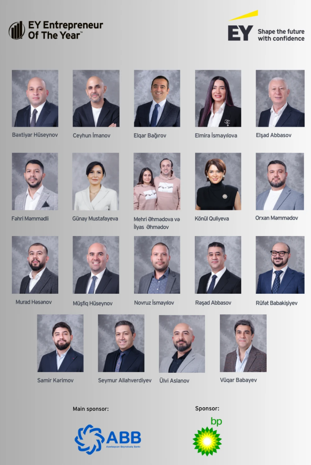 EY İlin İş Adamı EY Entrepreneur Of The Year EY İlin İş Adamı Azərbaycan EY sahibkarlıq müsabiqəsi EY biznes mükafatı Azərbaycanda sahibkarlıq müsabiqəsi ilin iş adamı 2026 EY milli mərhələ EY Qala tədbiri 13 fevral EY mükafatı Azərbaycan sahibkarları biznes liderləri Azərbaycan innovativ sahibkarlıq sosial təsirli bizneslər startap ekosistemi Azərbaycan alternativ enerji biznesi İT və rəqəmsal həllər təhsil sektoru biznesi turizm və kənd təsərrüfatı sahibkarları maliyyə və kredit təşkilatları qadın sahibkarlar Azərbaycan yerli istehsal və ixrac EY münsiflər heyəti ABB sponsorluğu bp sponsorluğu AZPROMO tərəfdaşlığı Paşa Holding SOCAR IFC Azərbaycan Code Academy MedLife Hospital Safavy Crocusoft Green Life Engineering AZSAFFRON yerli brendlər Azərbaycan EY World Entrepreneur Of The Year Monako biznes müsabiqəsi Azərbaycan biznesinin beynəlxalq təmsilçiliyi sahibkarlıq ekosistemi