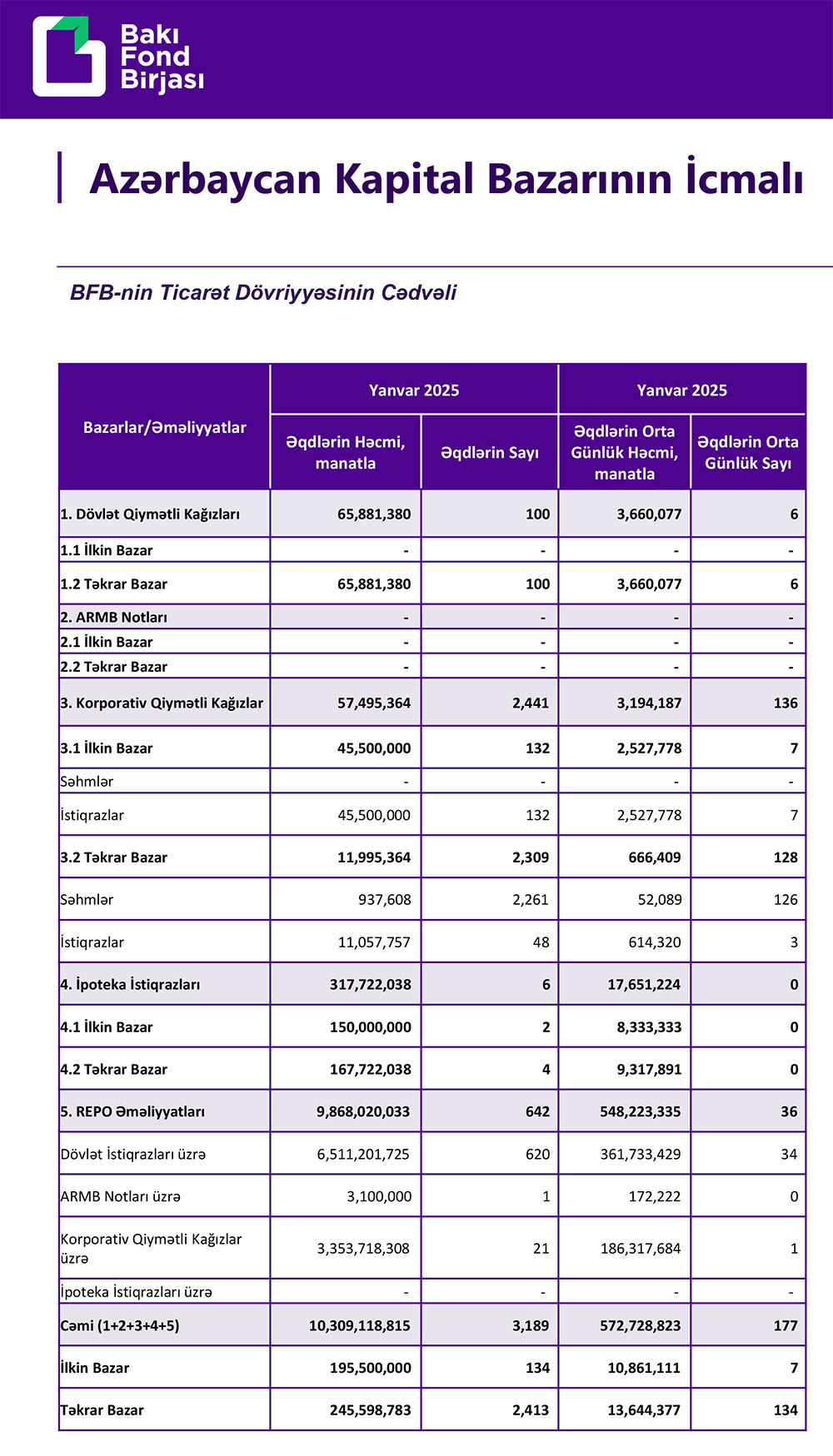 O cümlədən, Birjada REPO əməliyyatlaının həcmi 2025-ci ilin Yanva ayındakı 9 milyard 868 milyon 20 min manatdan 2026-cı ilin Yanvar ayında 4 milyard 756 milyon 887 min manata düşüb (2,1 dəfə azalıb).