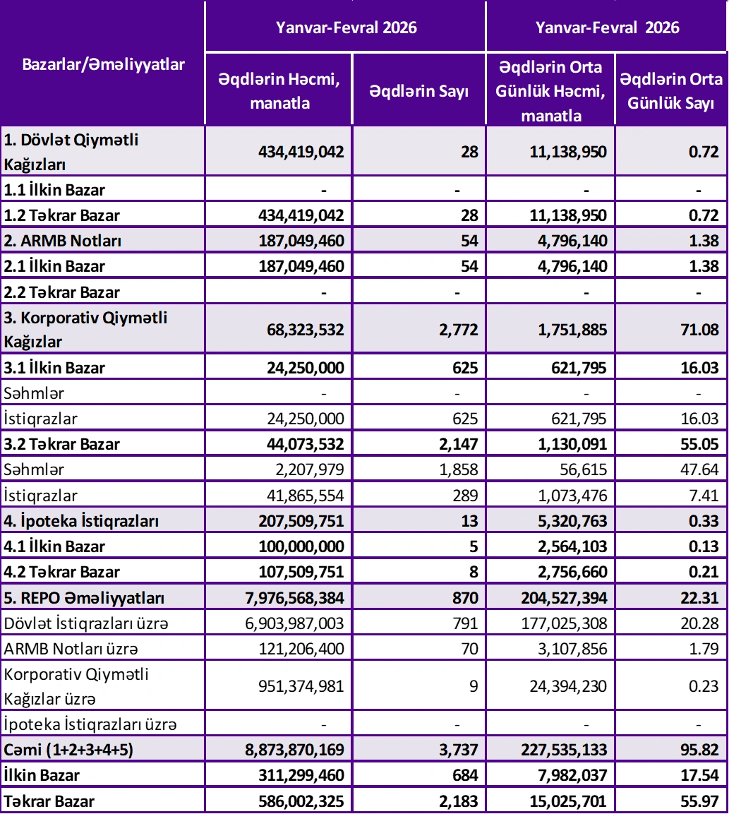 2025-ci ilin yanvar-fevral ayları ərzində (ilk 2 ayda) Bakı Fond Birjasında (BFB) əqdlərin cəmi həcmi 13 milyard 616 milyon 922 min manat təşkil edib.