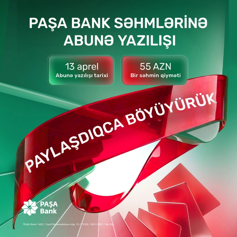 "PAŞA Bank" ASC gələn ay yerləşdirməyi planlaşdırdığı yeni səhmlərin ilkin yerləşdirmə qiymətini nominal dəyərindən (20 manat) 2,75 dəfə çox - 55 manat müəyyən edib. Başqa sözlə, "PAŞA Bank" yeni səhmlərini nominal dəyərindən 3 dəfəyə yaxın baha satmağı hədəfləyir.PAŞA Bank ilk dəfə olaraq səhmlərini geniş ictimaiyyətlə bölüşür və bununla ölkənin aparıcı özəl bankdan pay almaq imkanı verir.