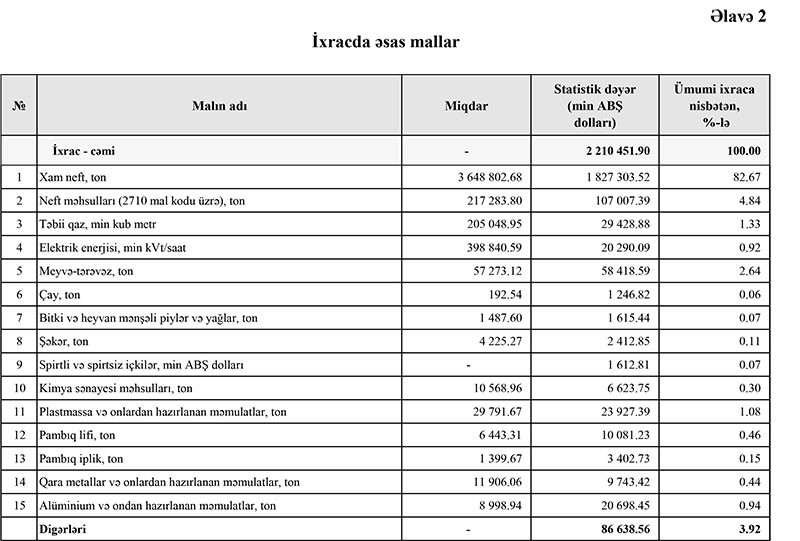 İdxal əməliyyatları 1 milyard 451 milyon 527 min ABŞ dolları, ixrac əməliyyatları 2 milyard 210 milyon 452 min ABŞ dolları təşkil edib. İxrac rəqəmində hesabat dövründə gömrük orqanlarında rəsmiləşdirilməsi başa çatdırılmış ixrac olunan xam neft və təbii qazın dəyərinə dair məlumatlar nəzərə alınmışdır.