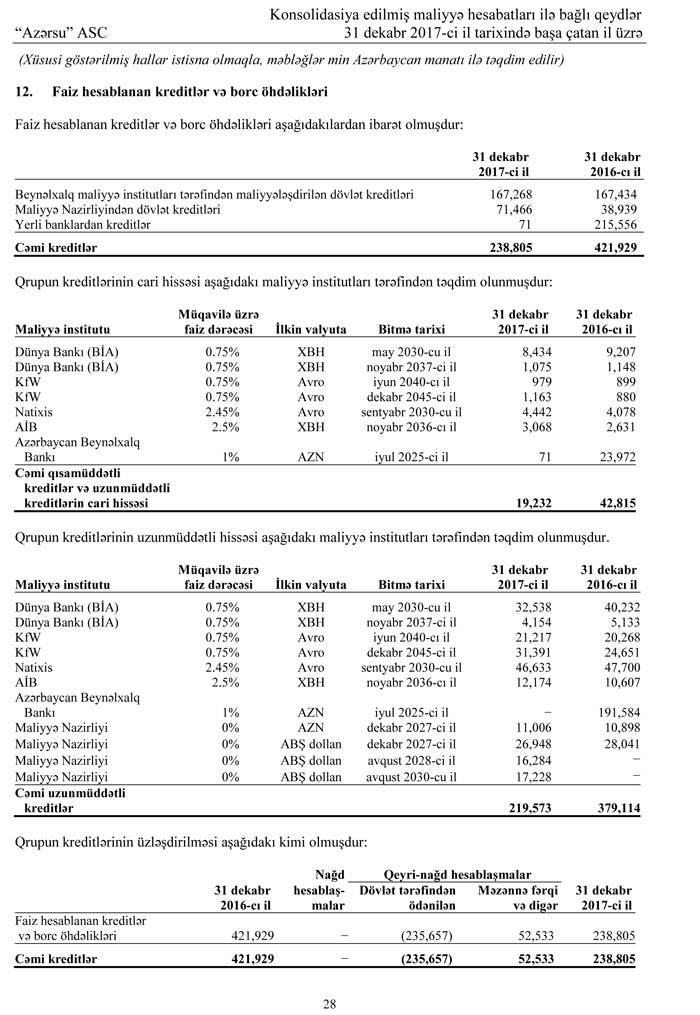 “15 iyul 2016-cı il tarixində Qrup Azərbaycan Respublikasının Beynəlxalq Bankı ilə faiz dərəcəsi illik 1% olmaqla 239 milyon 720 min manat məbləğində dövlət zəmanəti əsasında kredit razılaşmasını imzalamışdır. 31 dekabr 2016-cı il tarixinə “Azərsu” cari infrastruktur layihələrinin maliyyələşdirilməsi üçün bu kreditin tam məbləğində vəsait yönəltmişdir. Nazirlər Kabinetinin 14 mart 2017-ci tarixli 201S saylı sərəncamına əsasən kredit Təminat Fondu hesabına bağlanmışdır. 31 dekabr 2017-ci il tarixinə kredit üzrə 71 min manat məbləğində ödənilməmiş yığılmış faiz qalığı mövcuddur”,- Hesabatda deyilir.