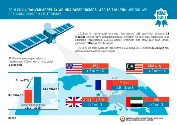 2018-ci ilin müvafiq dövrü ilə müqayisədə 2019-cu ilin ilk dörd ayında Rusiyaya qeyri-neft ixracı 22 faiz, Türkiyəyə 16 faiz, Gürcüstana 19 faiz, İsveçrəyə 13 faiz, İtaliyaya 2 dəfə artıb.