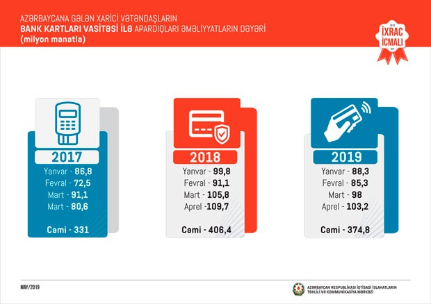2019-cu ilin aprel ayında isə qeyri-neft sektoru üzrə ixrac 167 milyon ABŞ dolları təşkil edib. 2018-ci ilin aprel ayı ilə müqayisədə bu ilin aprel ayında qeyri-neft sektoru üzrə ixrac 38 milyon ABŞ dolları və ya 29 faiz artıb. Cari ilin aprel ayında qeyri-neft sektoruna aid ən çox mal Rusiyaya (49,6 milyon ABŞ dolları), Türkiyəyə (48,6 milyon ABŞ dolları) və Gürcüstana (12 milyon ABŞ dolları) ixrac edilib.