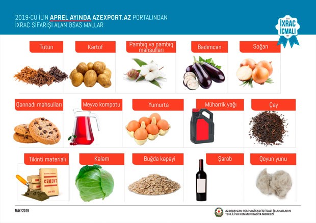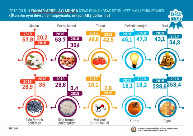 2018-ci ilin müvafiq dövrü ilə müqayisədə cari ilin yanvar-aprel aylarında alkoqollu və alkoqolsuz içkilərin ixracı 2,5 dəfə, pambıq lifinin ixracı 2,8 dəfə, pambıq ipliyinin ixracı 42 faiz, plastmassa və onlardan hazırlanan məmulatların ixracı 36 faiz, meyvə-tərəvəzin ixracı 34 faiz, kimya sənayesi məhsullarının ixracı 32 faiz artıb.