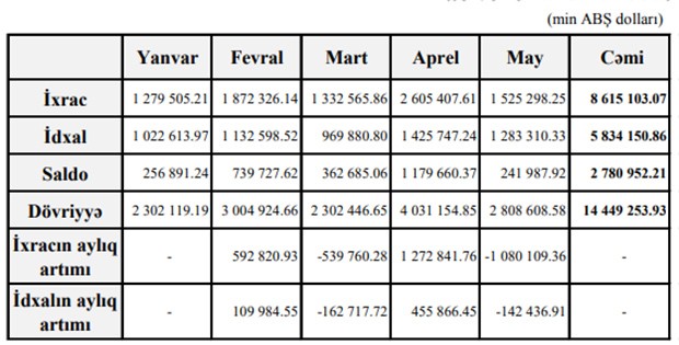 2019-cu ilin yamvar-may ayları ərzində Azərbaycanın ticarət əməliyyatlarının həcmi 14 milyard 449 milyon 253.93 min ABŞ dollar təşkil edib.