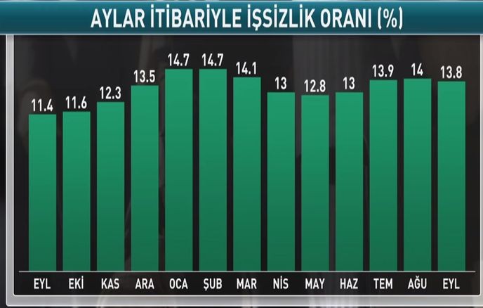 "Marja" xəbər verir ki, Türkiyə Statistika Komitəsinin (TÜİK) məlumatına görə, ölkədə 15 və daha yuxarı yaşdakı işsizlərin sayı 2019-cu ilin Sentyabr dövründə keçən ilin eyni dövrü ilə müqayisədə 817 min nəfər artaraq 4 milyon 566 min nəfərə yüksəlib. İşsizlik nisbəti 2,4 bənd artım ilə 13,8% səviyyəsində reallaşıb.