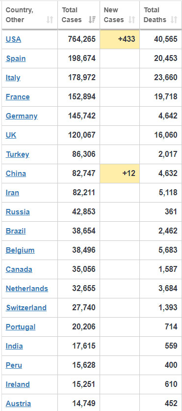 Ən çox yoluxma və ölüm halları ABŞ (764 min 265 - yoluxma, 40 min 465 - ölüm), İspaniya (198 min 674 – yoluxma, 20 min 453 - ölüm) və İtaliyada (178 min 972 – yoluxma, 23 min 660 - ölüm) qeydə alınıb.