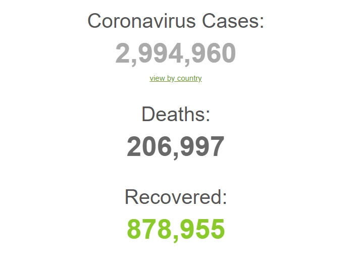 Dünyada koronavirusa yoluxduğu aşkarlananların sayı 2 milyon 994 min 960 nəfərə, ölənlərin sayı isə 206 min 97 nəfərə çatıb.