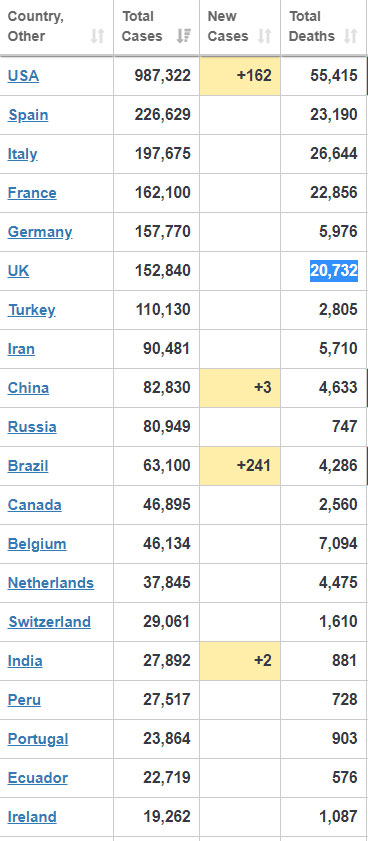 Yeni növ koronavirusdan ABŞ-da 55 min 415 nəfər, İtaliyada 26 min 44 nəfər, İspaniyada 23 min 190 nəfər, Fransada 22 min 856 nəfər, İngiltərədə 20 min 32 nəfər ölüb.
