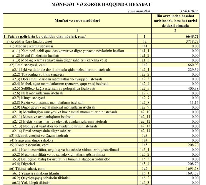 2017-ci ilin yanvar Mart dövründə Bankın faiz gəlirləri 6 milyon 648 manat, qeyri-faiz gəlirləri 2 milyon 349 min manat təşkil edib. Ötən ilin anoloji dövründə bankın faiz gəlirləri 4 milyon 785 min manat, qeyri-faiz gəlirləri isə 1 milyon 940 min manat təşkil etmişdi.