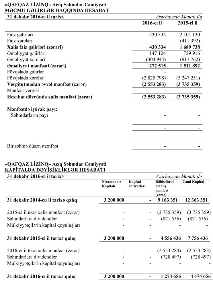 “QAFQAZ LİZİNQ” ASC 2016-cı ili 2 milyon 553 min manat xalis zərər ilə başa vurub.