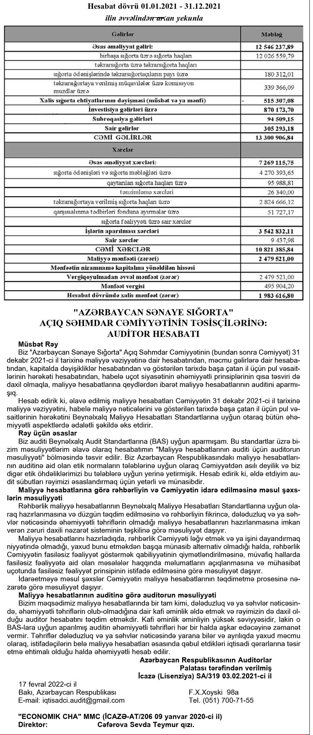 "Azərbaycan Sənaye Sığorta" ötən ili 2 milyon manata yaxın mənfəət ilə başa vurub