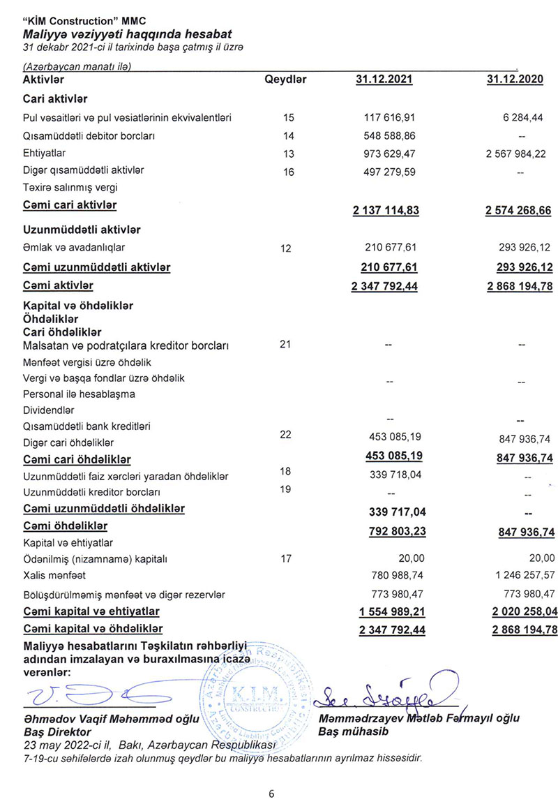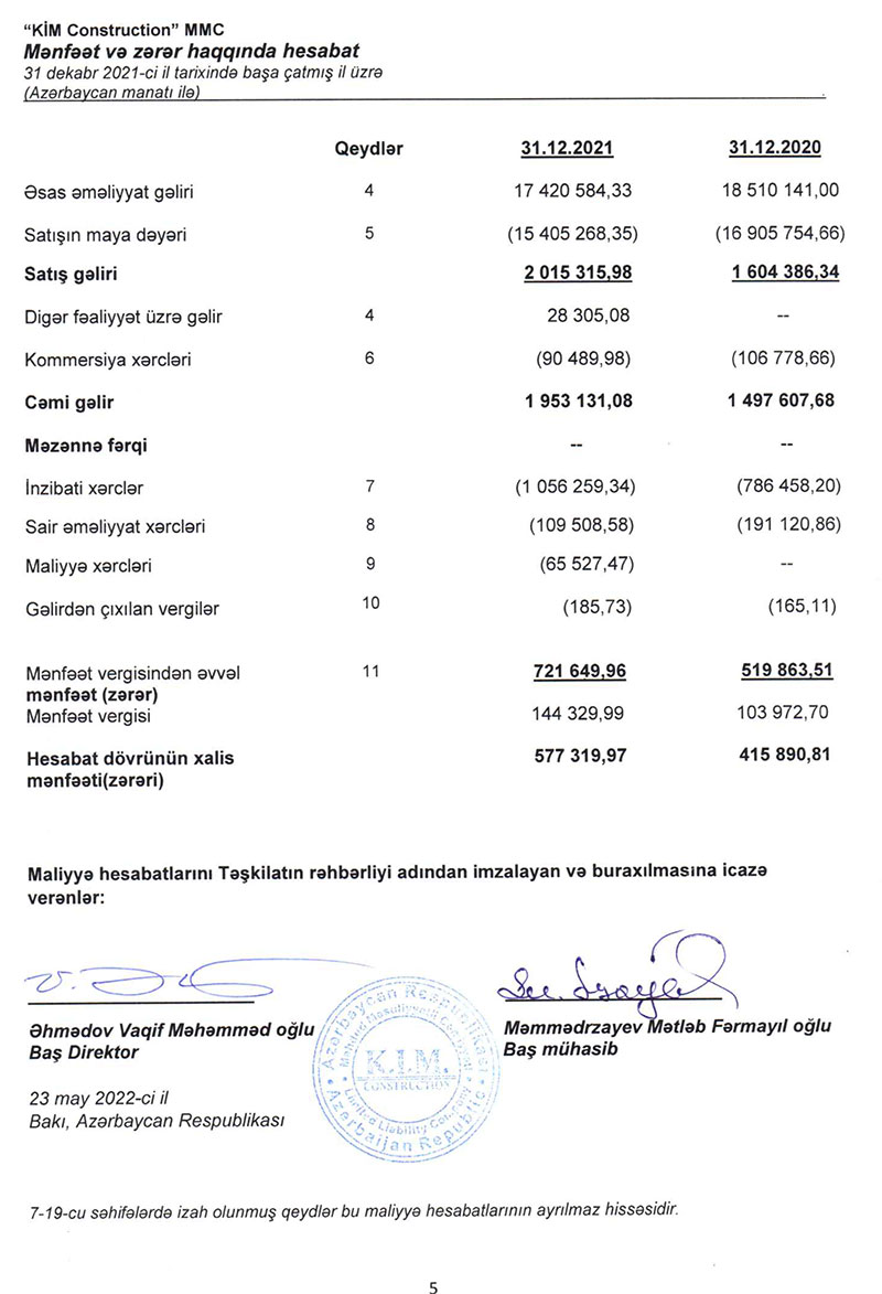Ötən il "KIM Construction" şirkətinin cəmi gəlirləri 17 milyon 448 min manat, cəmi xərcləri 16 milyon 871 min manat təşkil edib. 2020-ci ildə Şirkətin cəmi gəlirləri 18 milyon 510 min manat, cəmi xərcləri 18 milyon 94 min manat təşkil etmişdi.